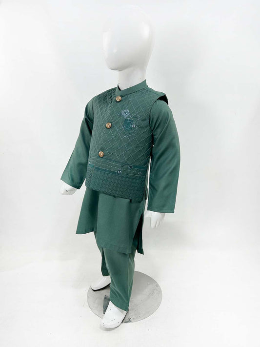 1Yrs - 11Yrs Dark Green Kameez Shalwar with Waistcoat For Boys AM BKS159