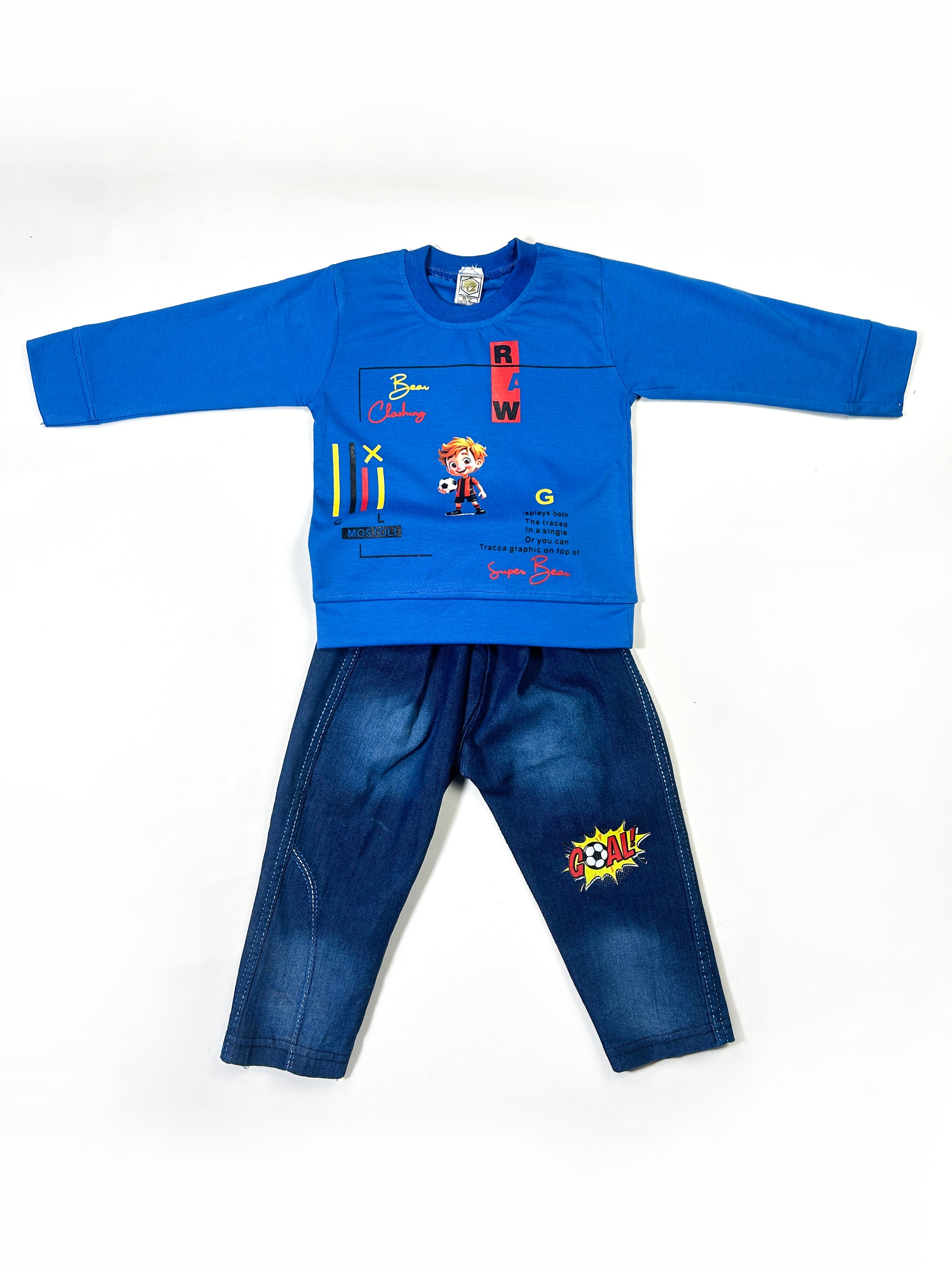 - Two-Piece Set: Includes a soft jersey fabric shirt and durable denim pants.
