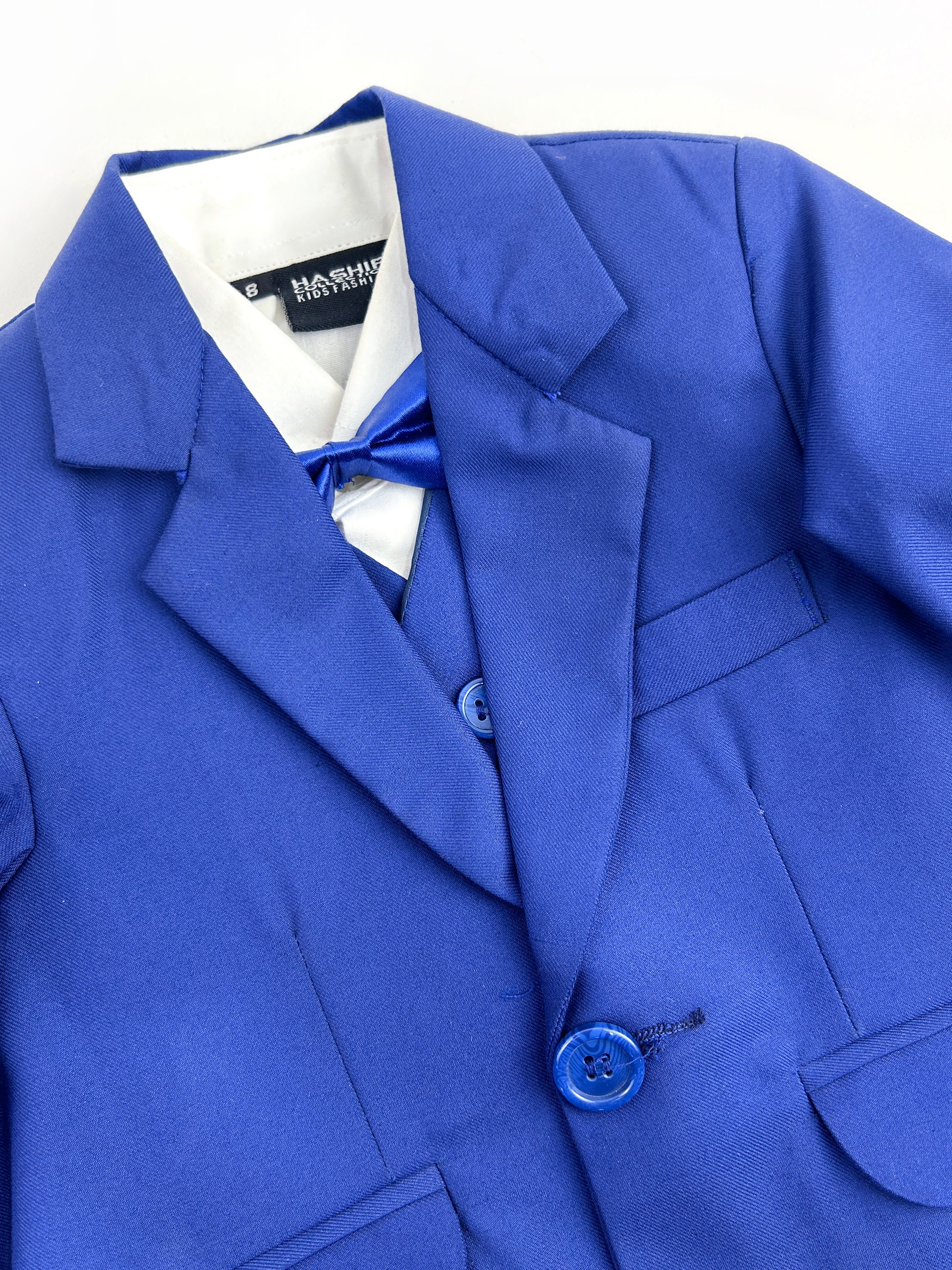 - 5-Piece Set: Includes a coat, pant, Waistcoat, Bow & shirt.